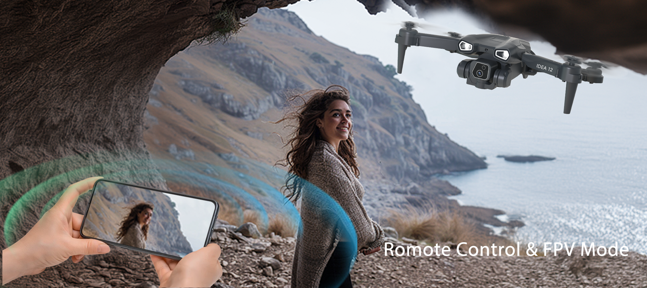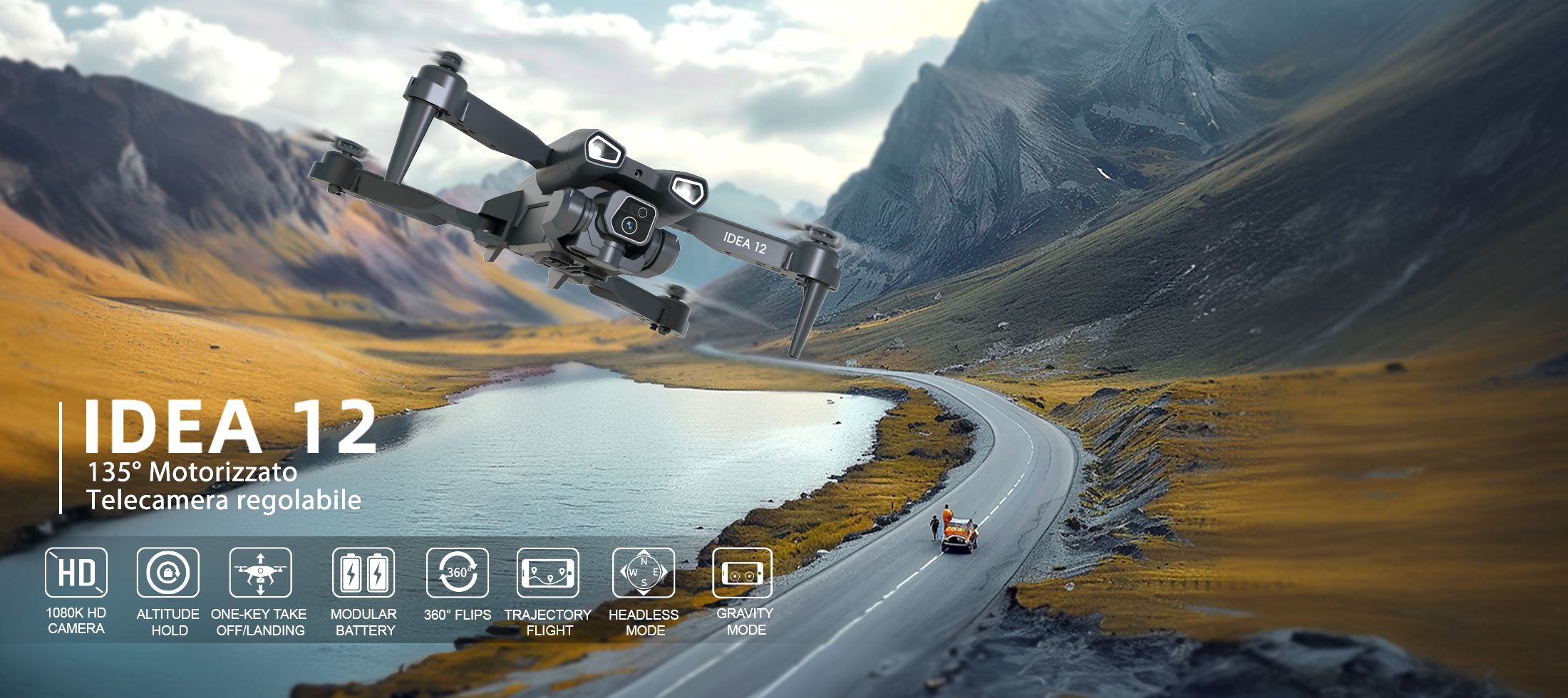【1080P HD + telecamera regolabile elettricamente a 135°】Il drone con fotocamera offre una risoluzione 1080P HD e il campo visivo grandangolare fornisce con un quadro più ampio. A differenza di altri droni, IDEA12 ti consente di controllare a distanza l'angolazione della telecamera utilizzando il telecomando per esplorare ogni esilarante angolo nell'aria. FPV trasmette in tempo reale, garantendo una trasmissione stabile delle riprese.